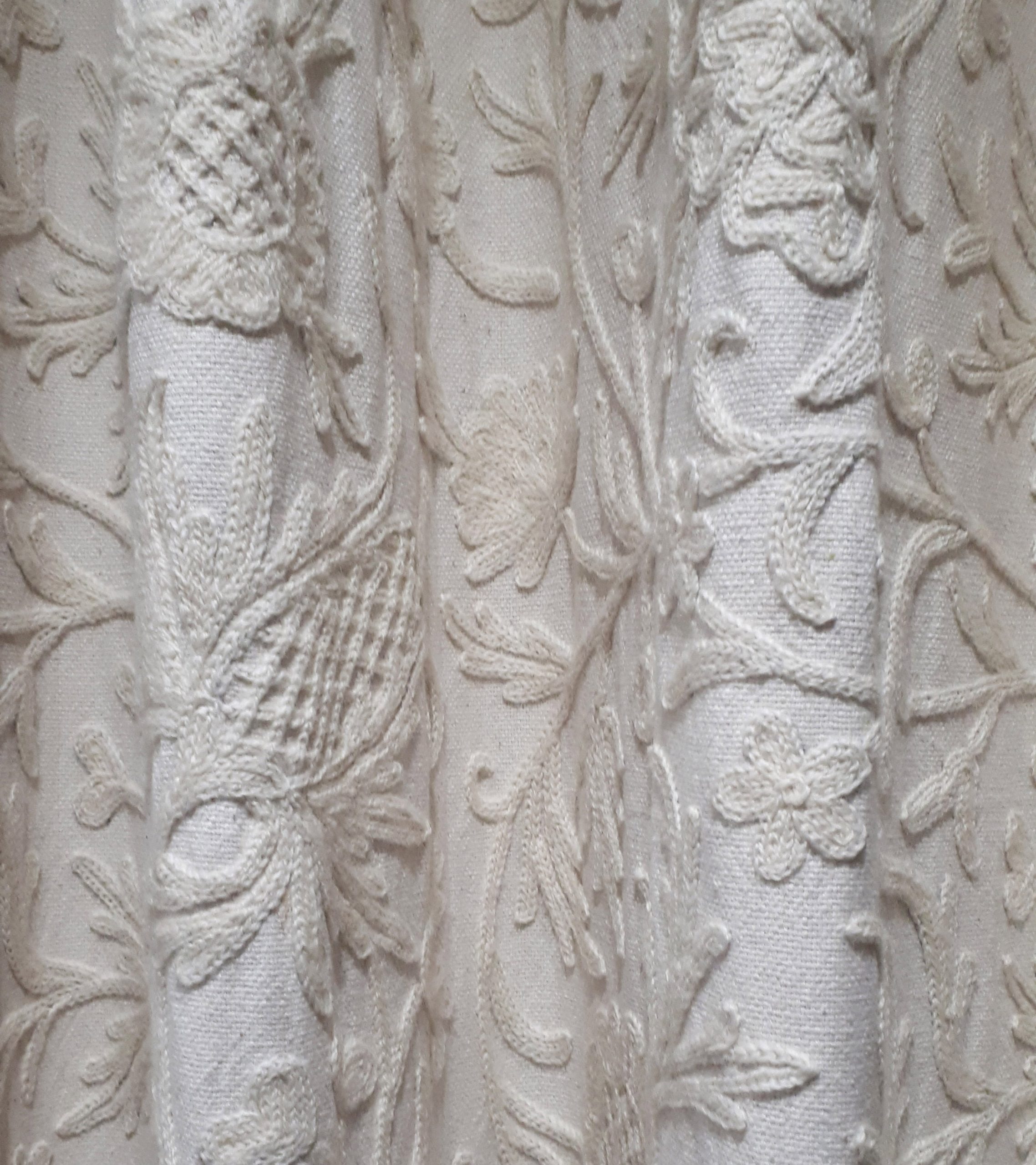 Description: Classic elegance in a richly embroidered cream on cream design – best seen held up to the window to experience the magical effect of sunlight through the embroidery – the absolute height of luxury in a bedroom with morning light streaming in. For those wanting a more discreet effect, interlining will make the fabric opaque, still allowing for an opulent and tactile experience without any obvious fuss. A favourite with top interior designers.